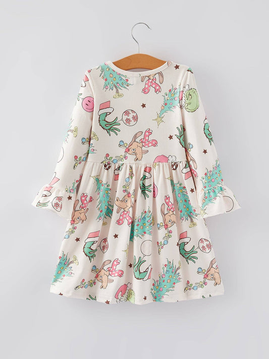Christmas Character Print Girls Dress with Ruffle Sleeves