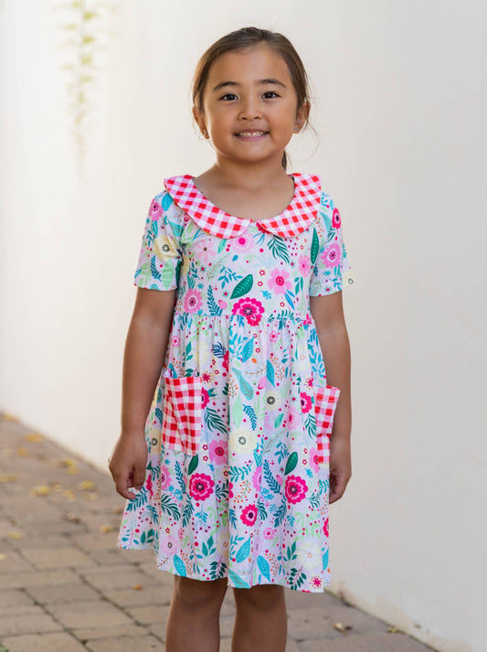 Gingham Bows 3/4 Sleeve Ruffle Twirl Dress