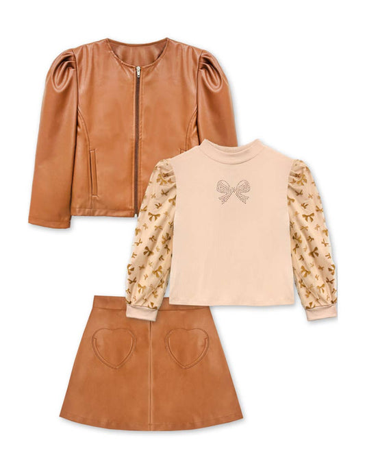Girls Beige Coquette Bow Ruffle Pocket Button Legging Set
