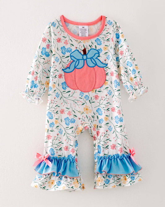 Rylee Faith Designs - Halloween Baby Girls Ruffle Pumpkin Applique Floral Print Bow Romper