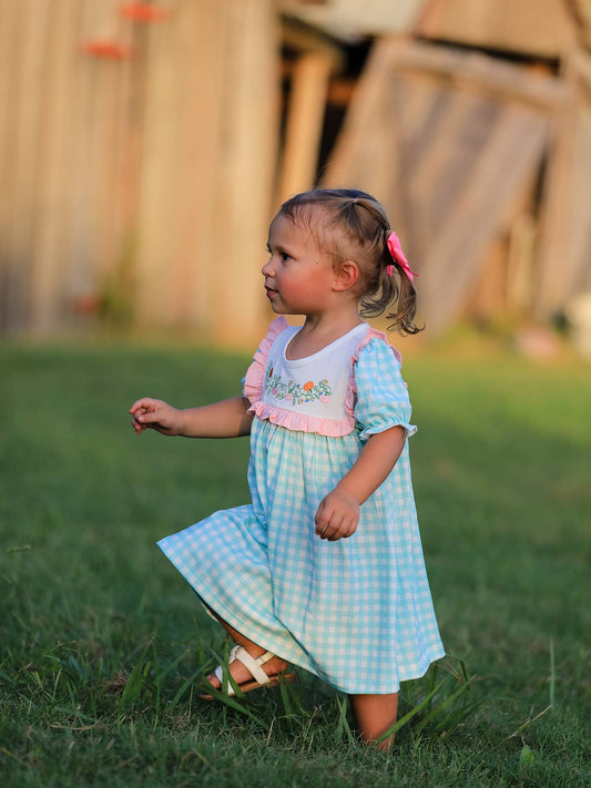 Thanksgiving Day Fall Pumpkin Flowers Embroidered Check Girls Dress