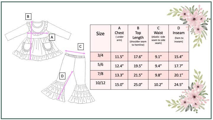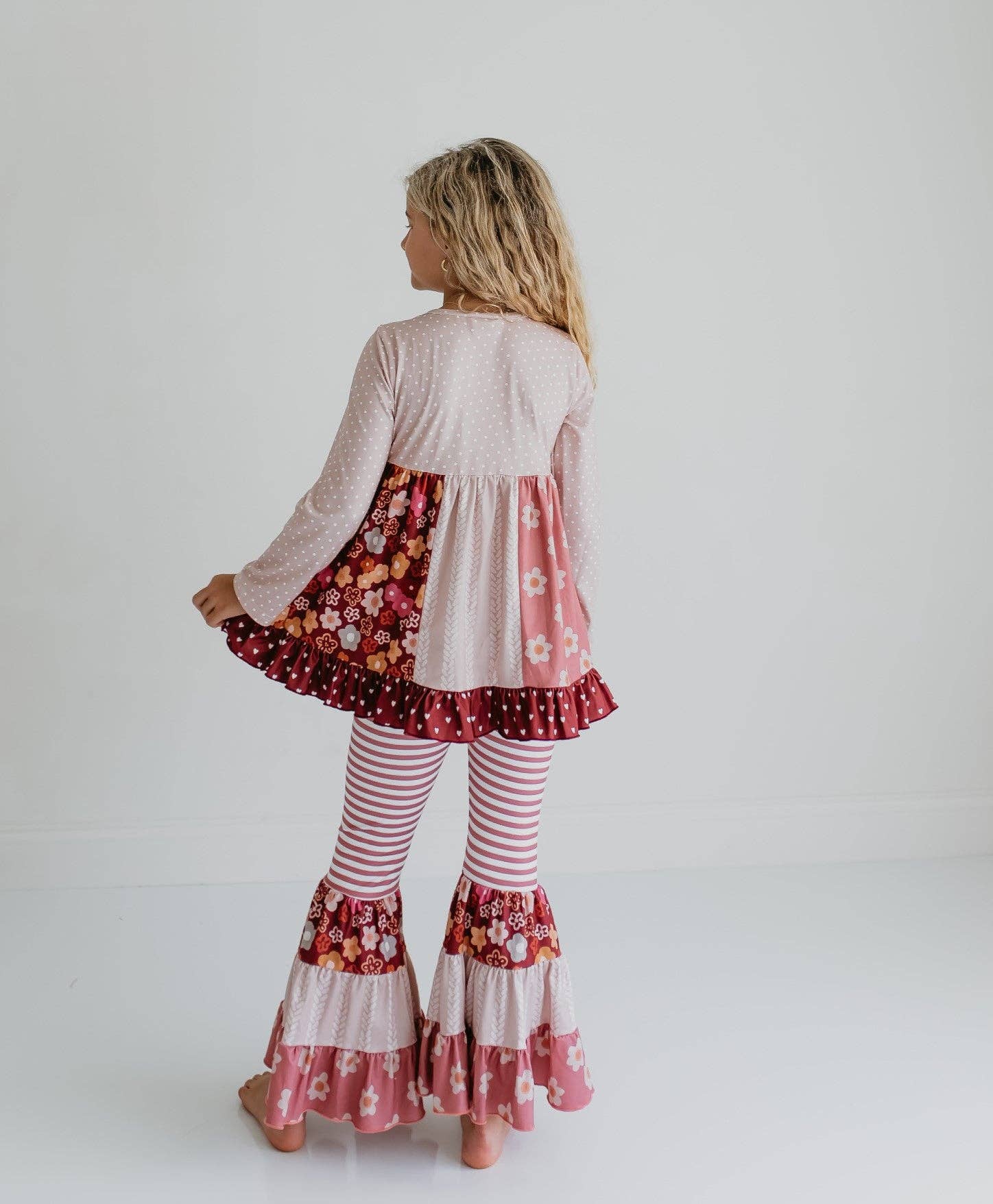 Get ready to bloom in this Beige Floral Bell Bottom Ruffle Pant Set! This set features playful stripe, heart and floral prints, perfect for any little fashionista. Pockets and ruffle accents make this a show stopper for back to school in the fall.