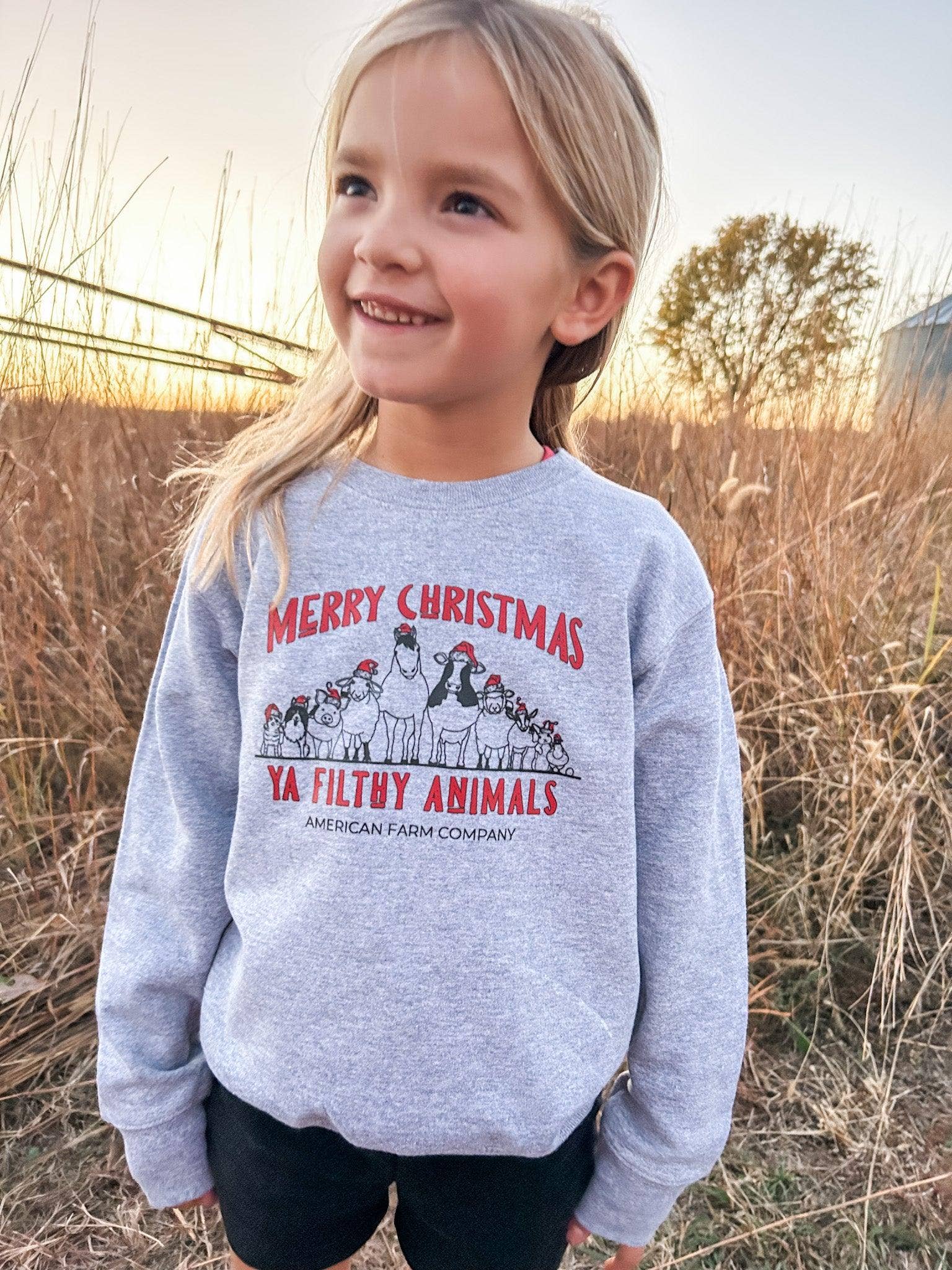 Get your little ones in the holiday spirit with our 'Merry Christmas Ya Filthy Animals Crew' toddler and youth crewneck! Featuring our best-selling design of farm animals dressed in festive attire, this must-have holiday attire will have your kids looking cute and stylish. Available in toddler and youth sizes.
