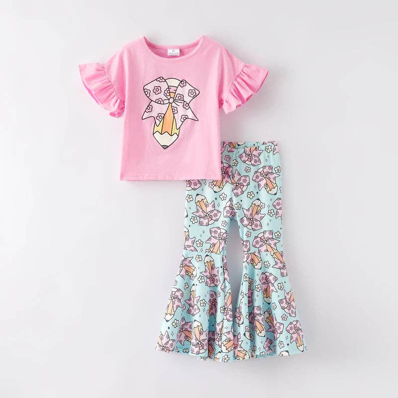 Girls Back To School Pencil Print Pink Cotton Top Pant Set