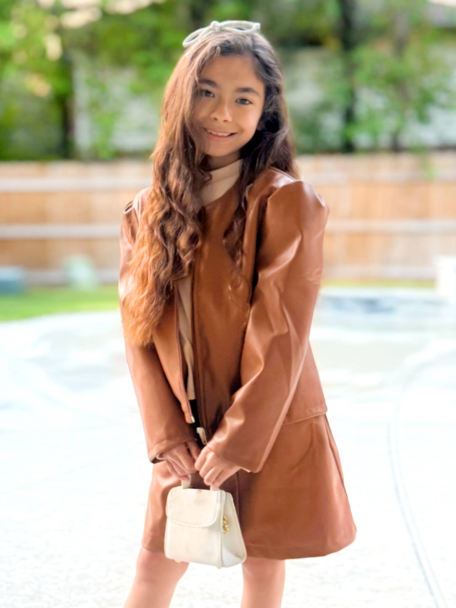 Girl's 3 pc Pleather Skirt Set W/ Bow Rhinestones + Pleather Jacket