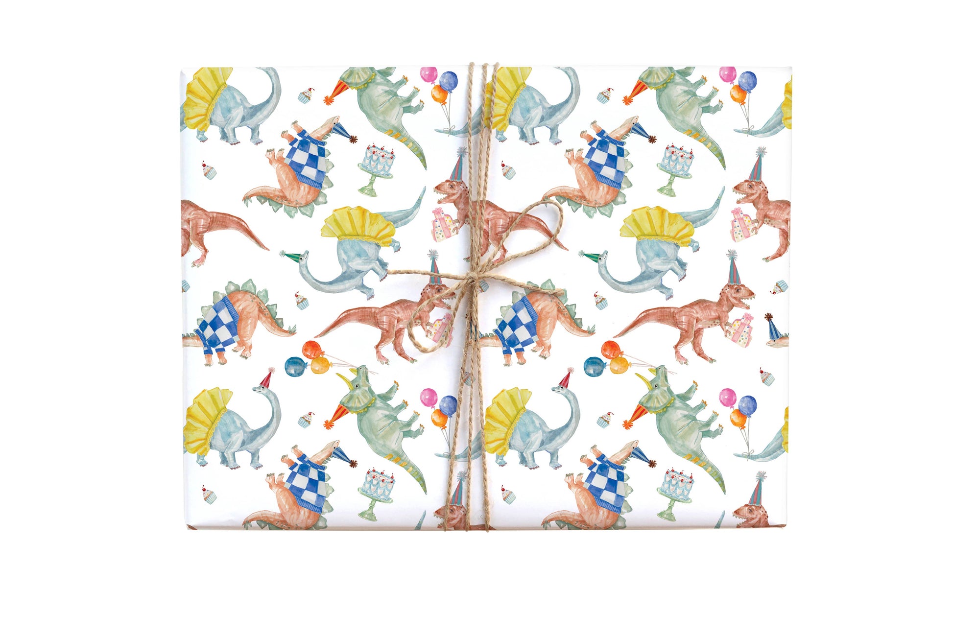 Here come the dinosaurs! Who could resist a delightful, dino-wrapped gift, with hand- painted T-Rexes, brontosauruses, stegosauruses, and triceratops bringing balloons and cakes to the party? This paper celebrates all those dino lovers, and the wrap is sure to spark lots of smiles.