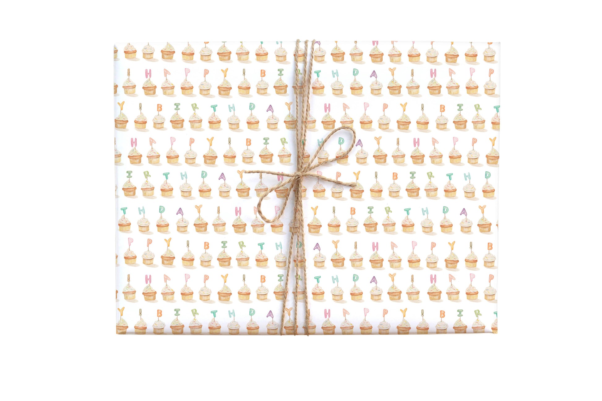 Hand-painted cupcakes and lettering makes gorgeous wrapping paper for all those birthday celebrations.
