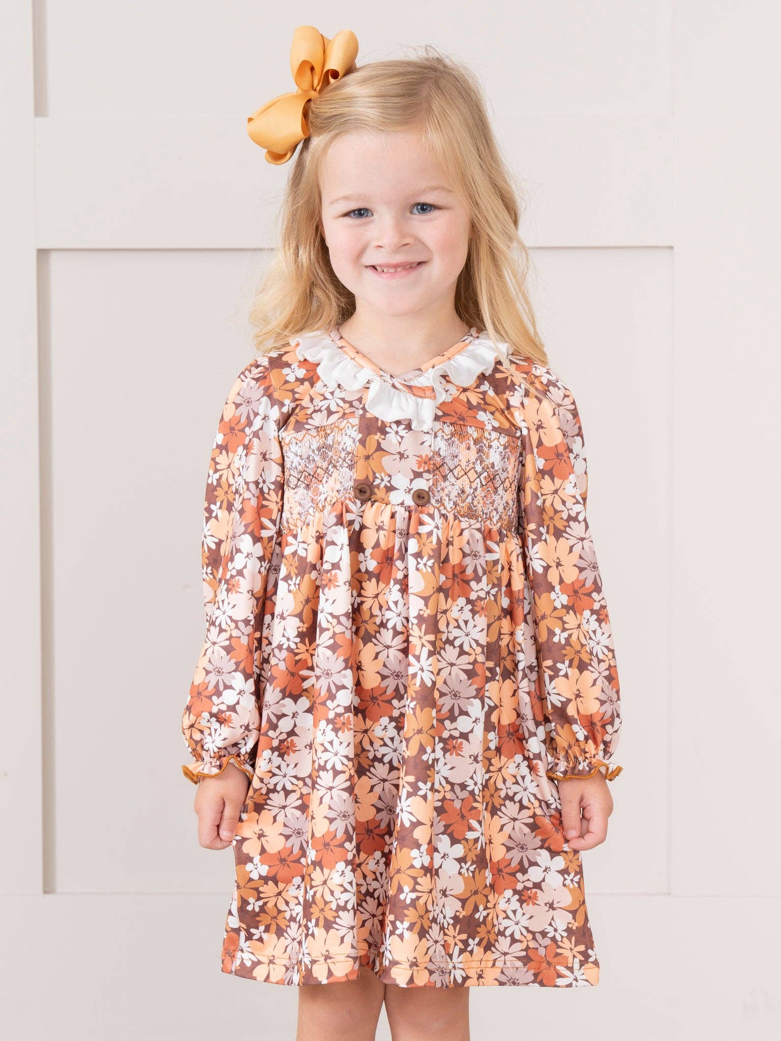 Introducing the Brown Autumn Florals Ruffle Dress - for the playful and stylish little girl! This girls dress features a smocked bodice and a unique autumn florals print, paired with a charming white ruffle collar. Complete the look with the matching sister set.