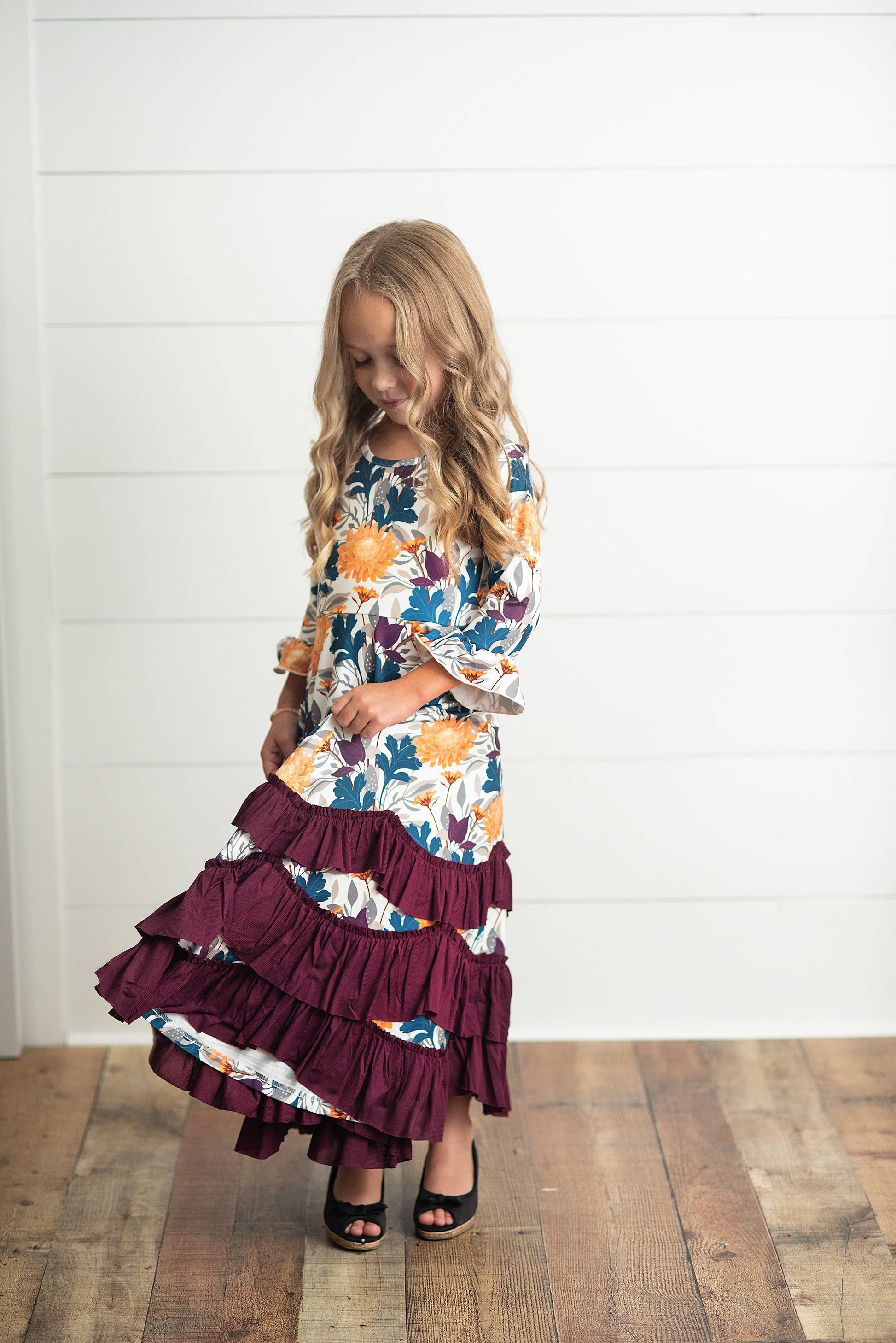 Girls dark plum & mustard Floral Print Long Sleeve Twirl Dress with dark plum Ruffles. Twirl in this dress for days!