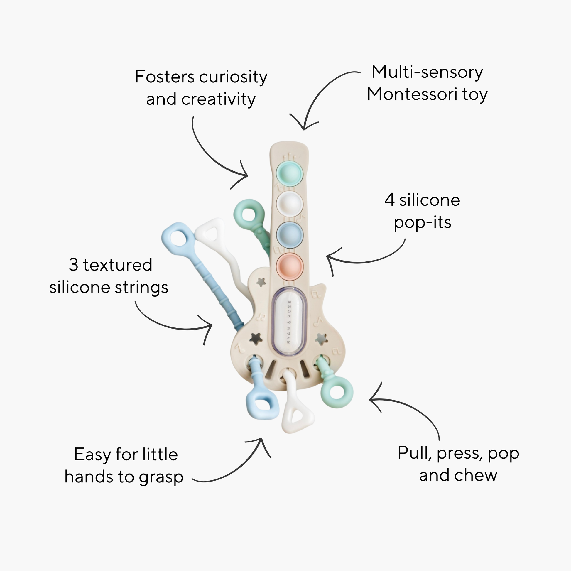 Constructed from 100% safe materials, this portable toy has flexible, soft edges that are easy for little hands to grasp and explore while supporting fine motor development, sensory exploration, and hand-eye coordination. With its compact, easy-to-clean design, the Rockin’ Guitar Toy is perfect for at home or on the go, ensuring continuous entertainment and stimulation. As they strum, pop, and explore, this interactive toy helps nurture a love for music from an early age, making it a great choice for all babies.