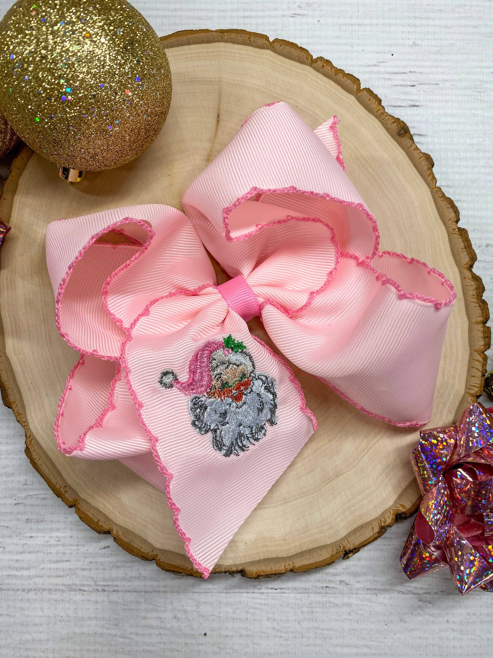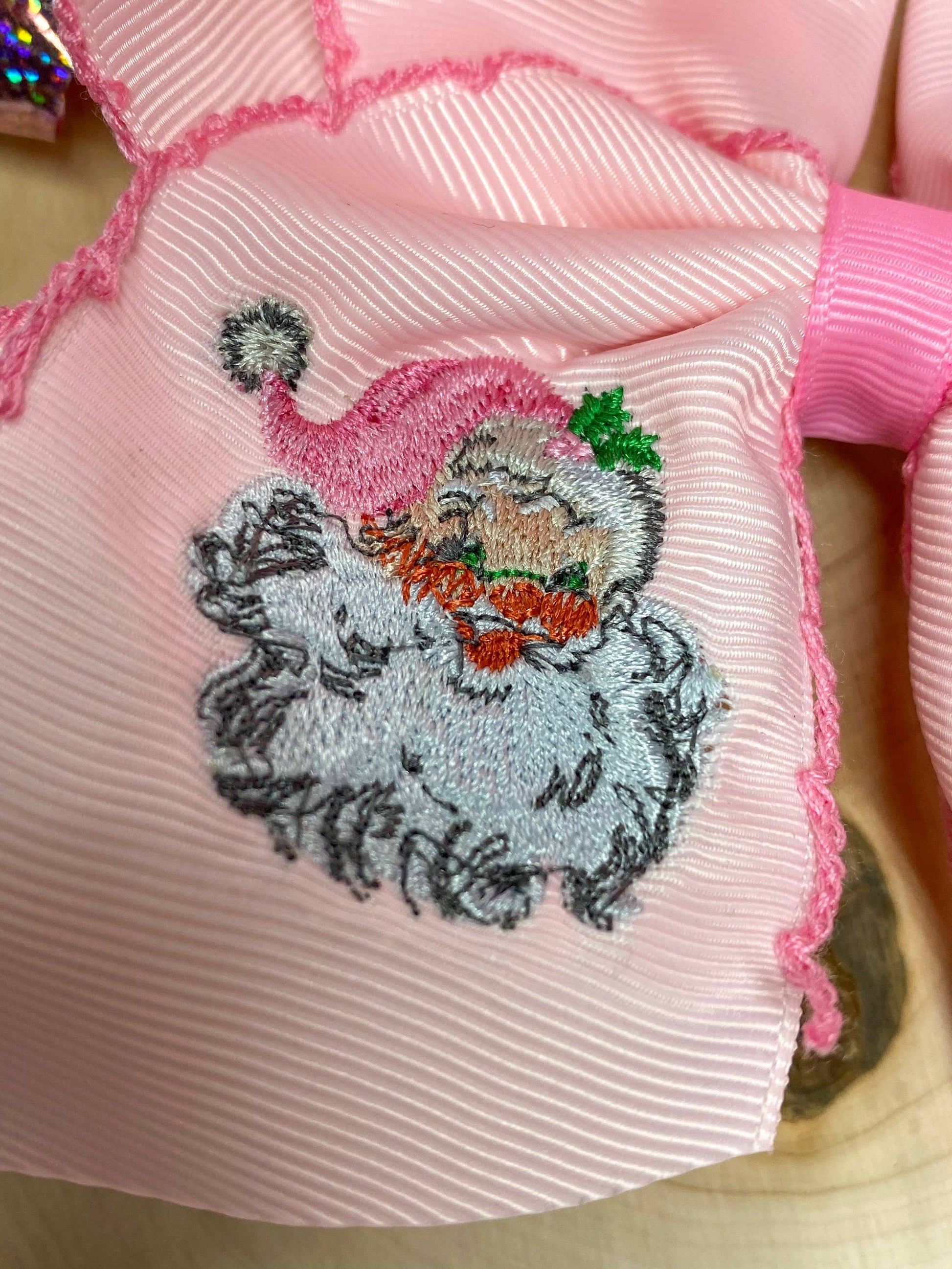 Add a festive touch to your holiday look with the Pink Santa Embroidered Hair Bow. Expertly crafted, this charming accessory features detailed Santa embroidery on a soft pink base, combining seasonal cheer with subtle elegance. Perfect for adding a playful yet refined accent to any hairstyle during the holiday season.