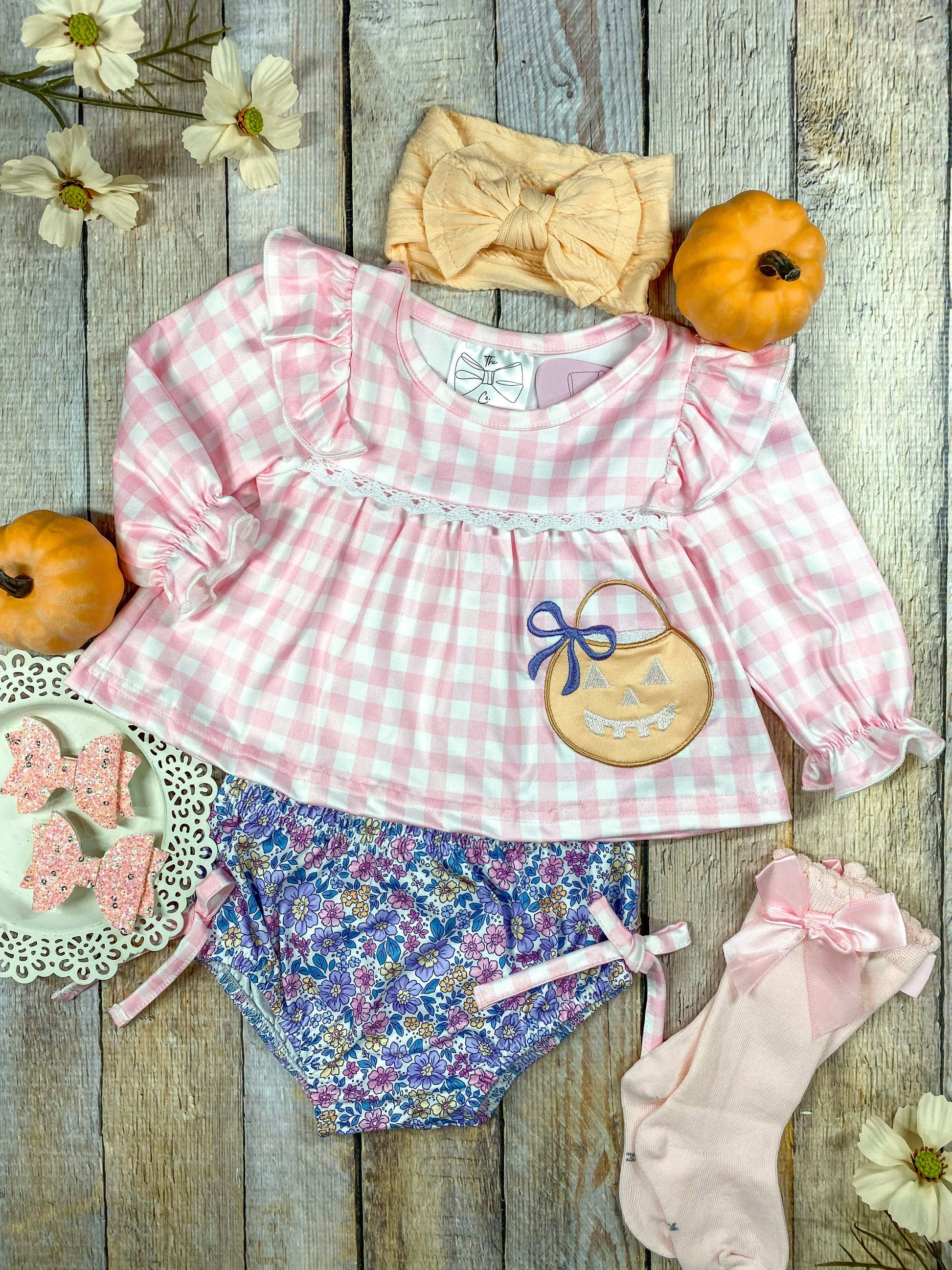 Dress your little one in festive fun with the Trick or Treat Gingham & Floral Infant Romper! Featuring a charming mix of classic gingham and delicate floral patterns, this romper is perfect for Halloween. Soft, comfortable fabric ensures your baby stays cozy while looking adorable!